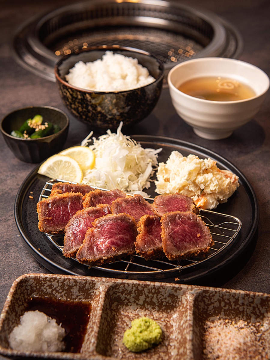 希少部位A5ランクカイノミを使った牛カツは程よいサシも入った旨みのある柔らかい赤身で、「ひめの凛」を使用した炊きたてご飯との相性も抜群。ご飯は小盛から特盛まで好みの量を選べる。