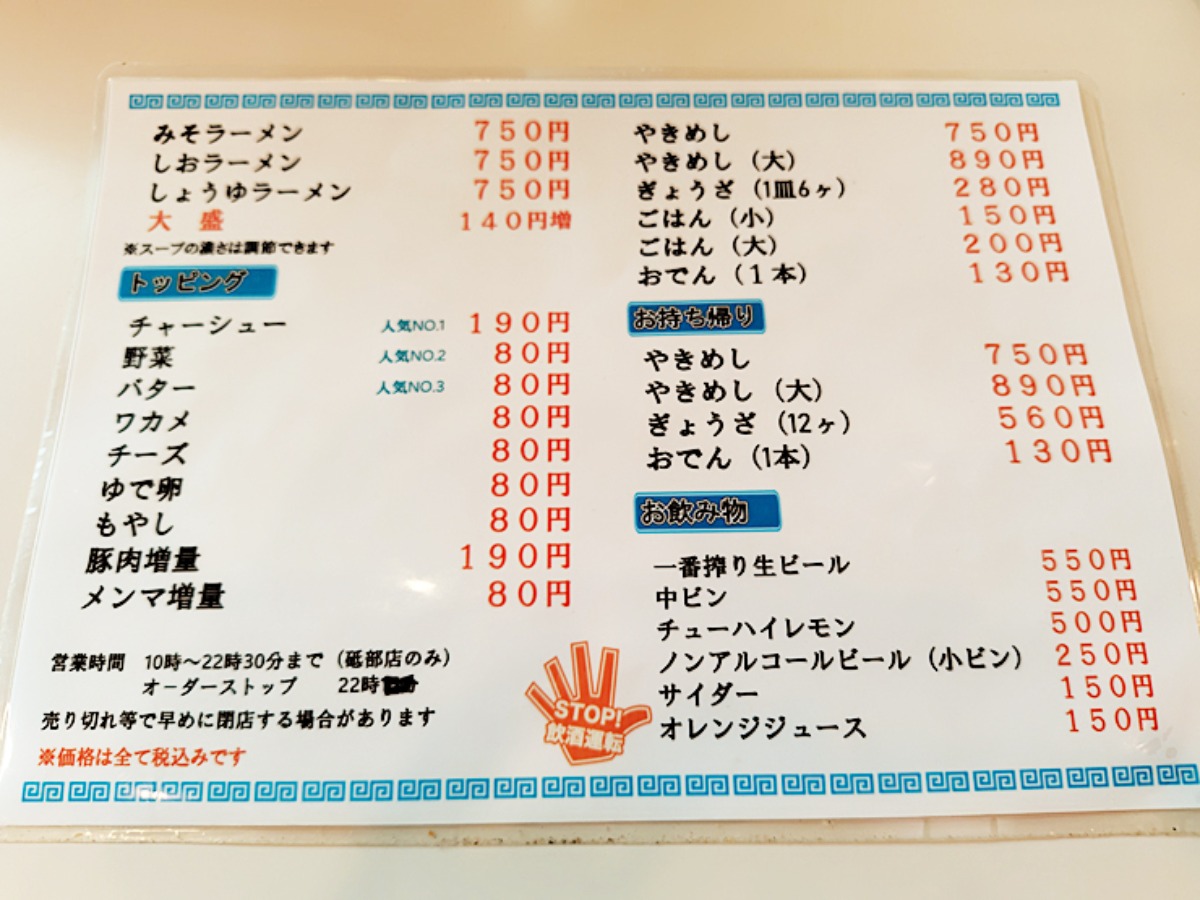 シンプルなメニュー表。ラーメンはどの種類も750円。