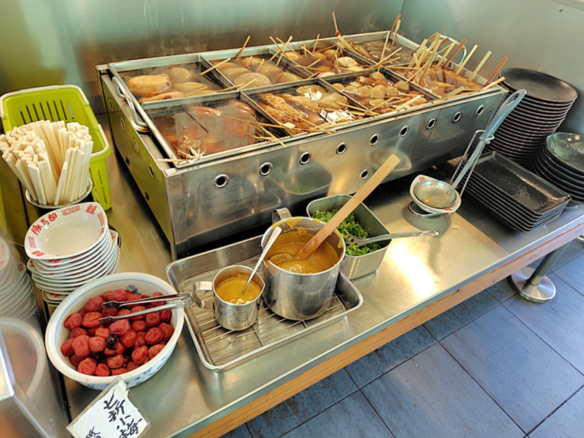 種類が豊富なおでんコーナーはどれでも一本130円。手前には七折小梅の梅干しが。