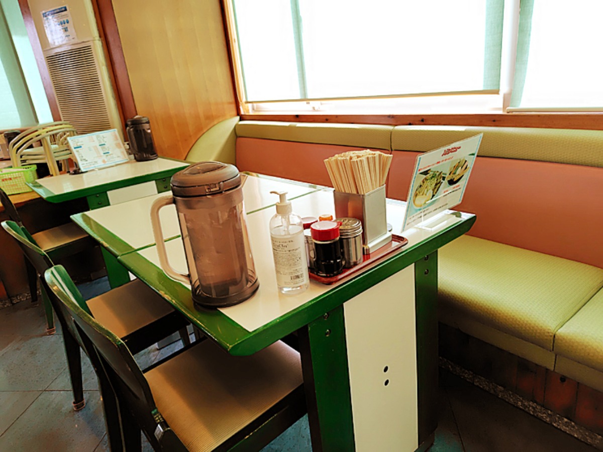 テーブルと椅子はグリーンが基調。清潔感のある店内です。