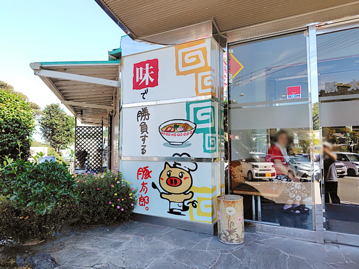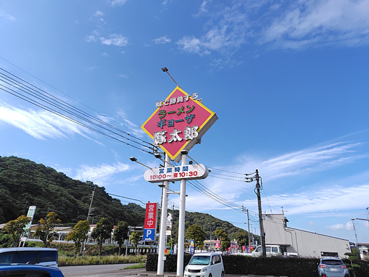 「味で勝負する ラーメン ギョウザ 豚太郎」の大きな赤い看板が立っています。