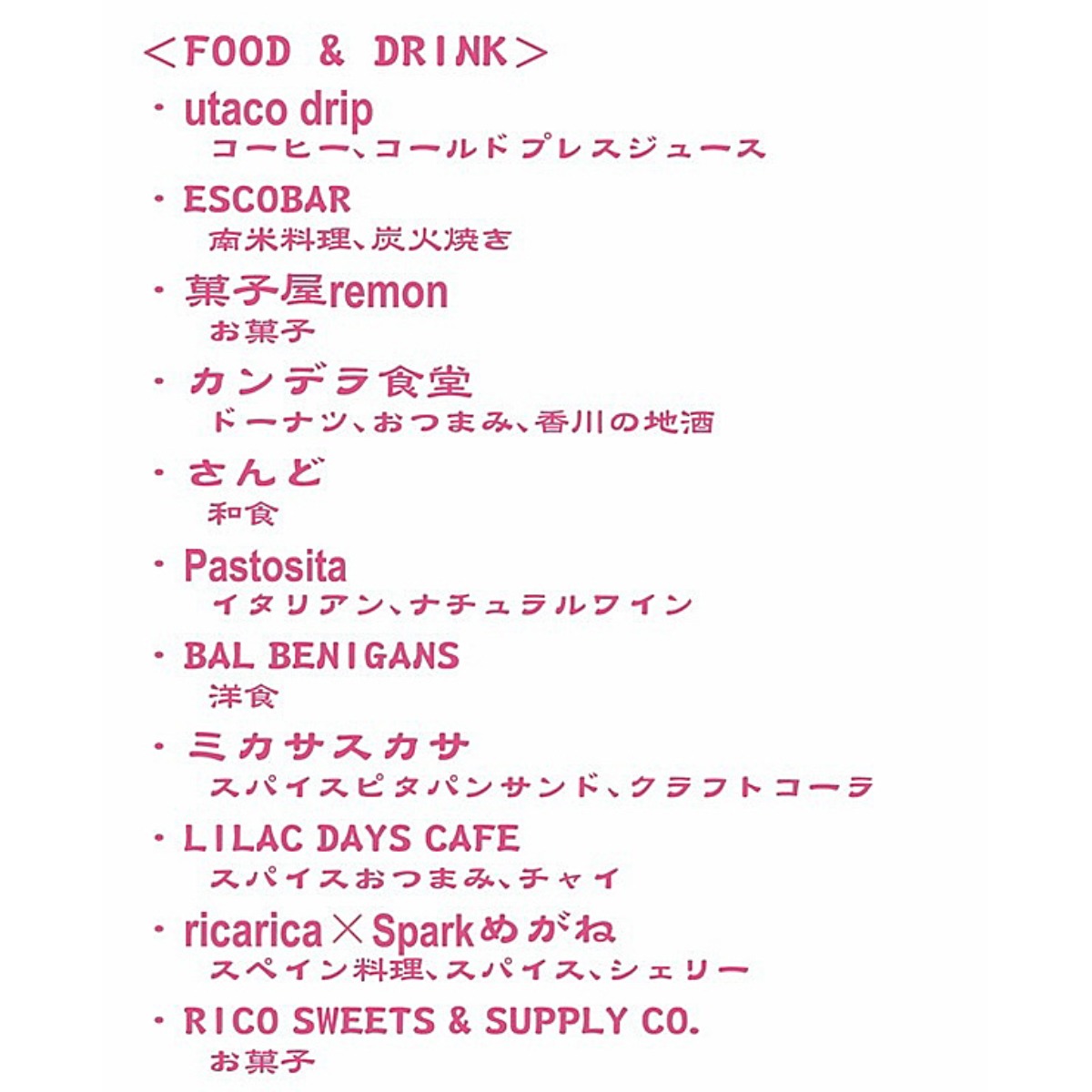 主催の「LILAC DAYS CAFE」をはじめ、「ミカサスカサ」、「utaco drip」、「RICO SWEETS & SUPPLY CO」など、地元の人気店による十数件のブースが勢ぞろいします。