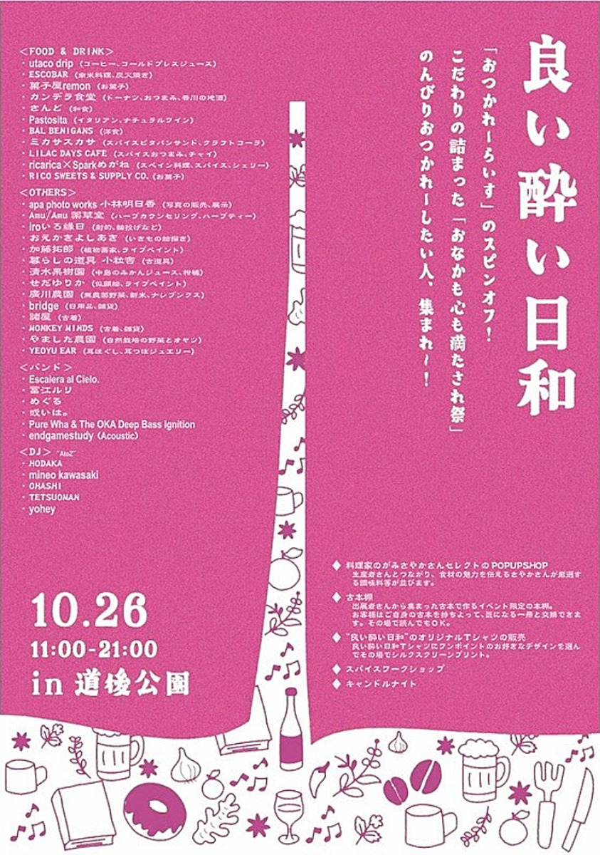 店主さんがこれまでにたびたび主催していたカレーイベント「おつかれーらいす」のスピンオフ企画となるイベント「良い酔い日和」が、2025年10月26日に松山市の道後公園で開催されます。