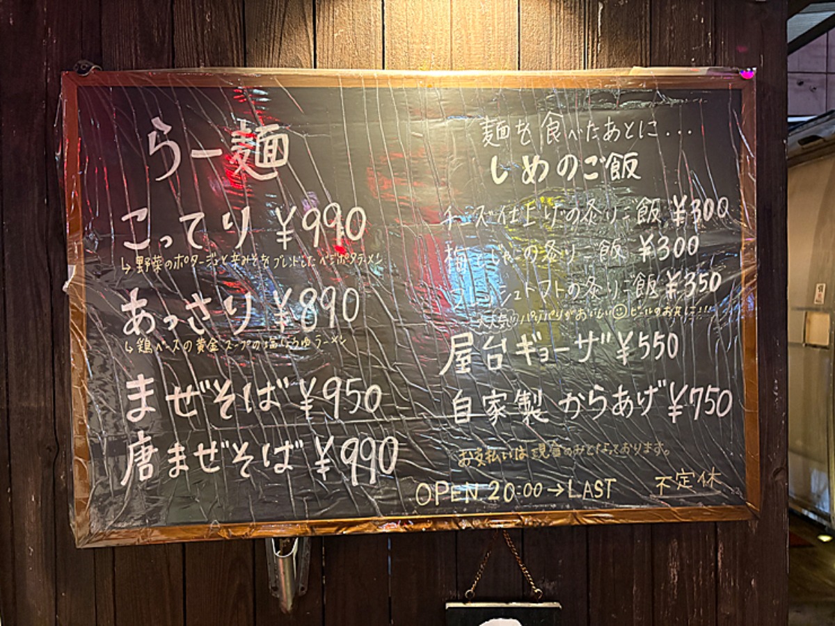 ラーメンは「あっさり」「こってり」「まぜそば」「辛まぜそば」の4種類。