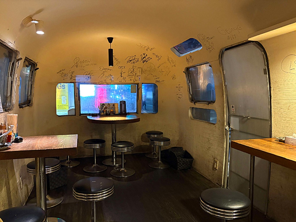 壁に有名人のサインがずらりと並ぶトレーラー席で特別感を楽しむのも良し。