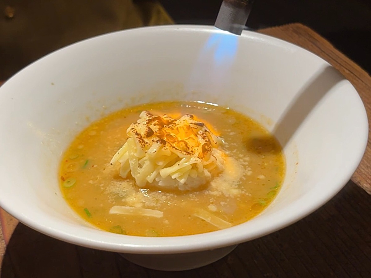麺を食べ終えて店員さんに声をかけると、目の前でバーナーを使って仕上げてくれます。