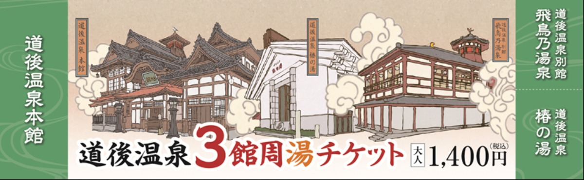 道後温泉本館の全館営業再開を記念して、「道後温泉3館周湯チケット」を販売中。このチケット1枚で、「道後温泉本館」、「飛鳥乃湯泉」、「椿の湯」の3つの温泉に、それぞれ1回入浴することができます。通常料金より2割お得になるので、この機会に道後温泉巡りをしてみませんか。贅沢な湯巡り体験を楽しんでくださいね。
