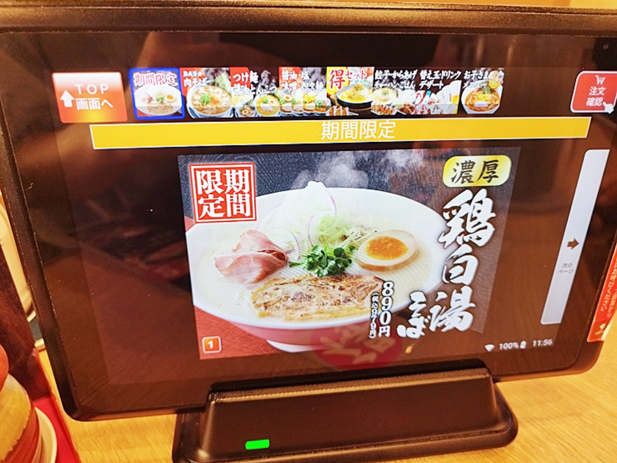注文はタッチパネルで。期間限定の鶏白湯そばも気になるところ。