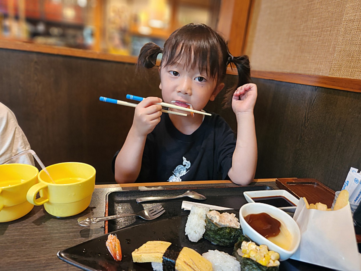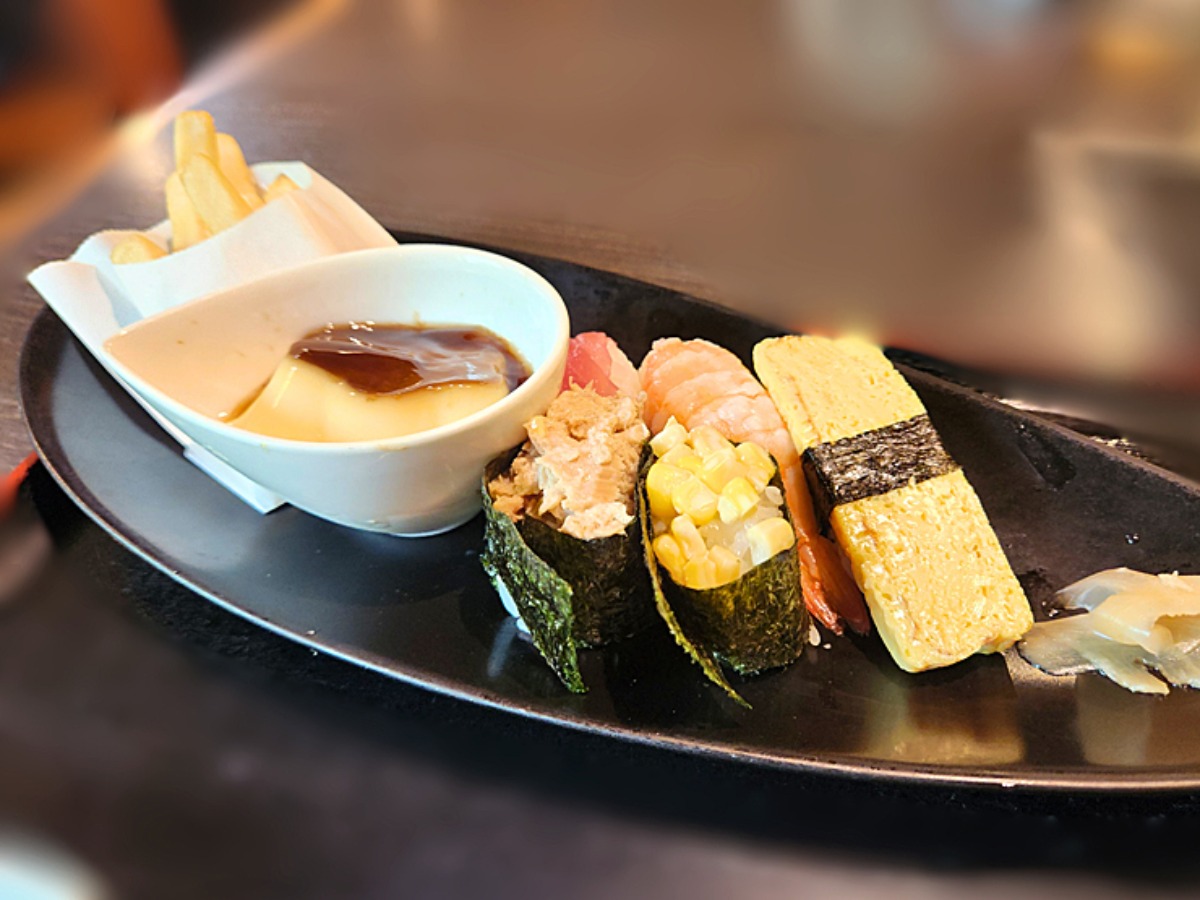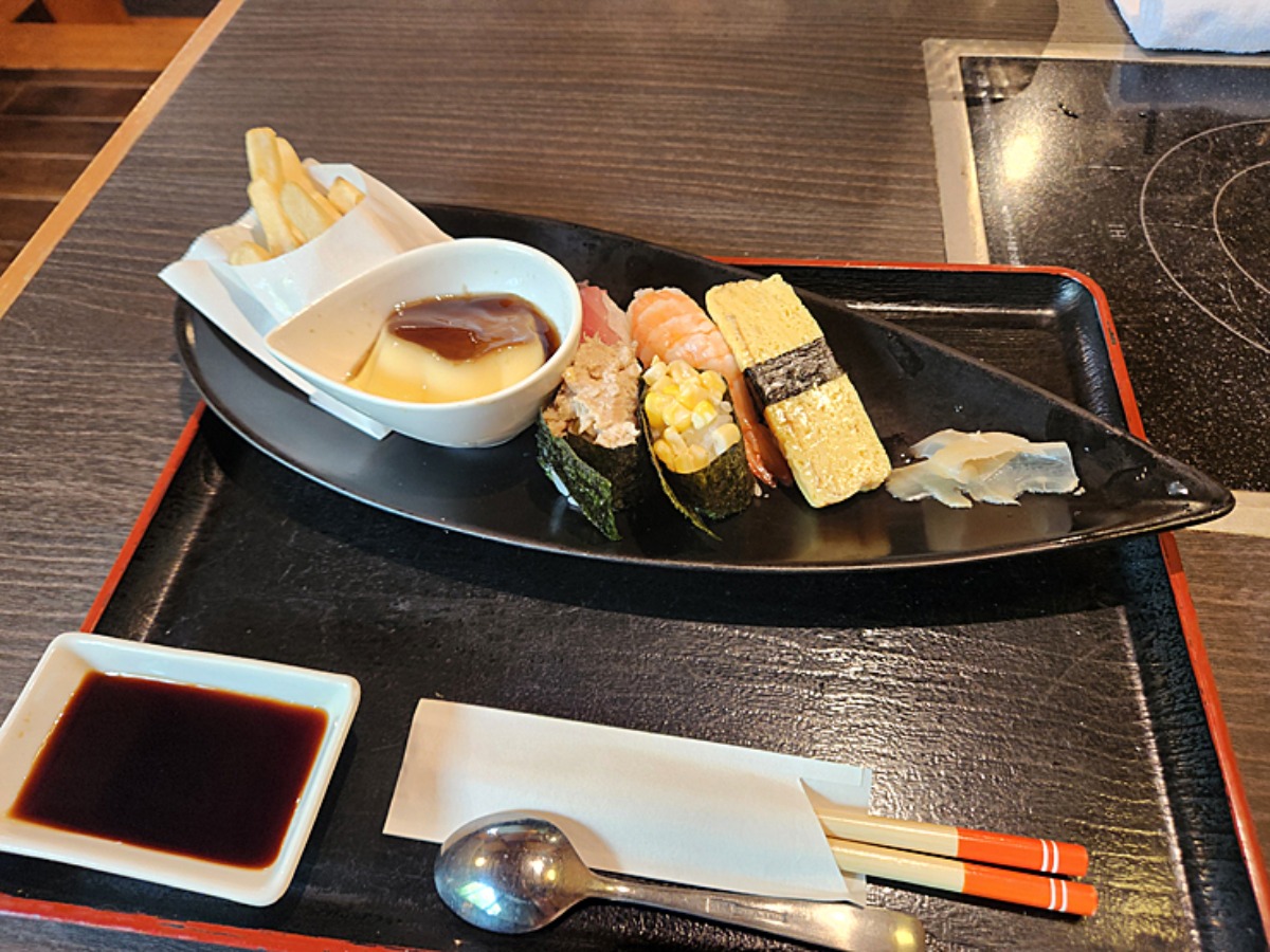 マグロ・エビ・玉子・ツナ・コーンの定番ネタに、ポテトやプリンに選べるジュースもついて大喜び。