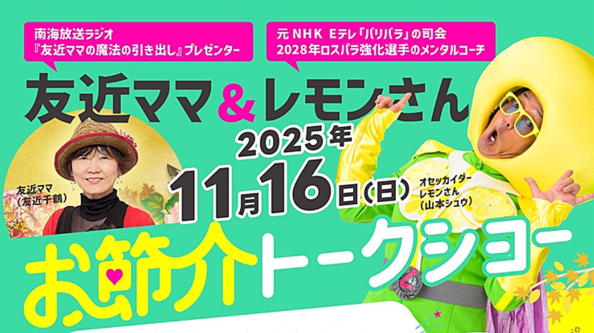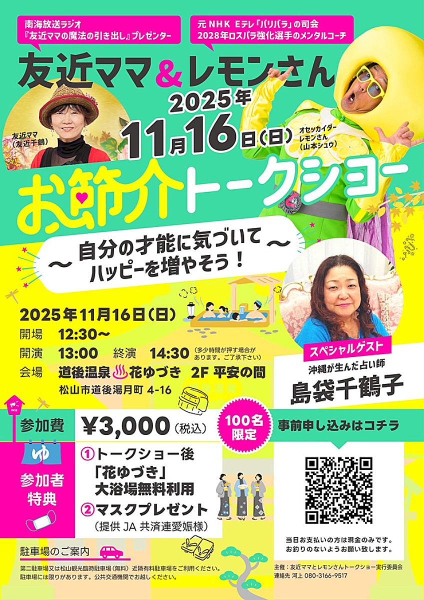 2025年11月16日(日)、「道後温泉 花ゆづき」にて「友近ママとレモンさんのお節快トークショー~自分の才能に気づいて、ハッピーを増やそう~」が開かれます。