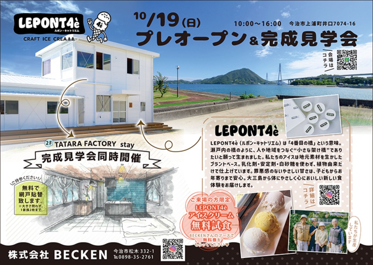 10月末、大三島にオープンするアイス屋さん「LEPONT4è」のプレオープンと、絶景を楽しめる民泊施設「TATARA FACTORY stay」の完成見学会を同時開催!