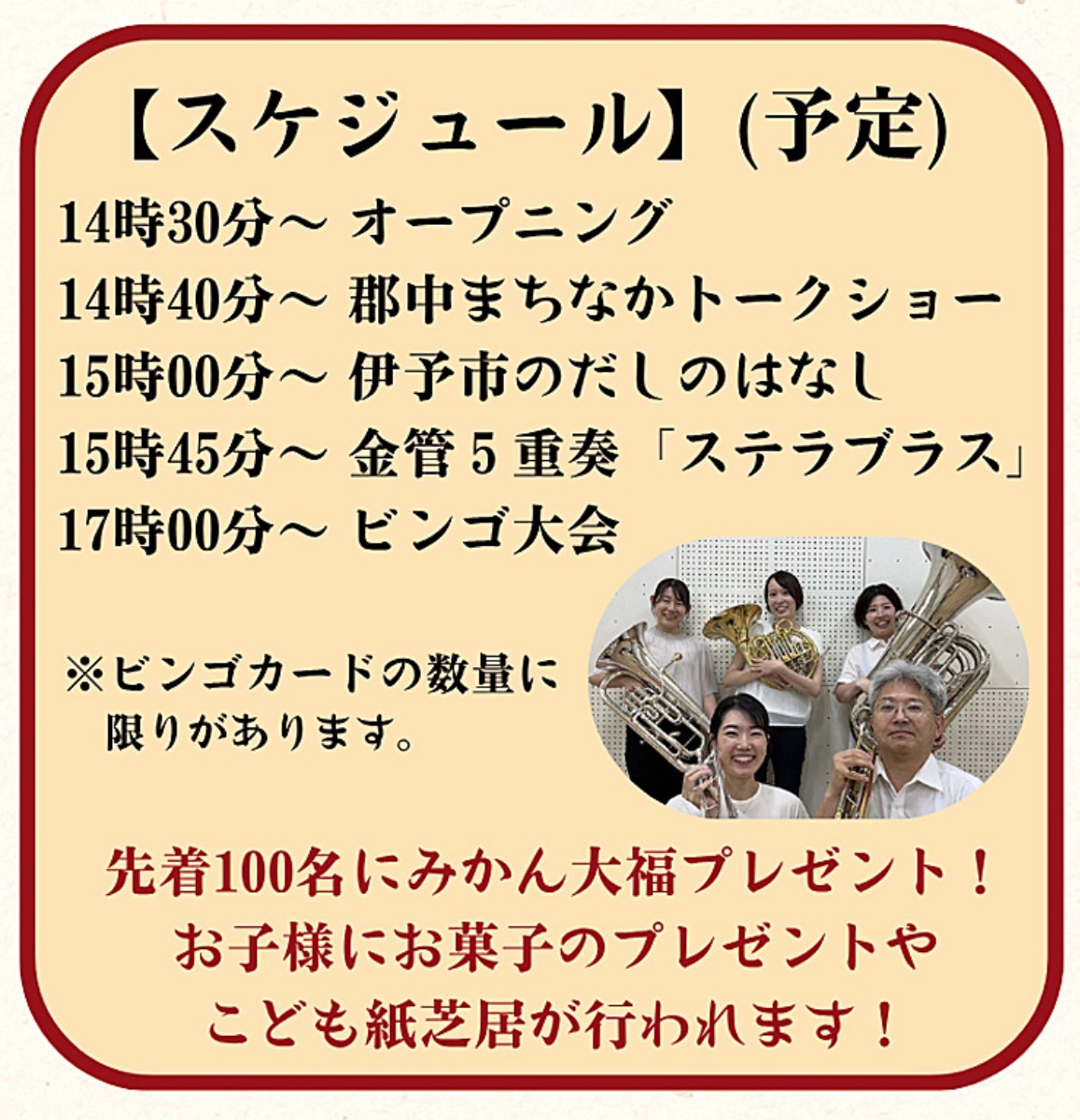 郡中まちなかトークショーや伊予市のだしの話、金管五重奏「ステラブラス」の生演奏など多彩なプログラムが続きます。