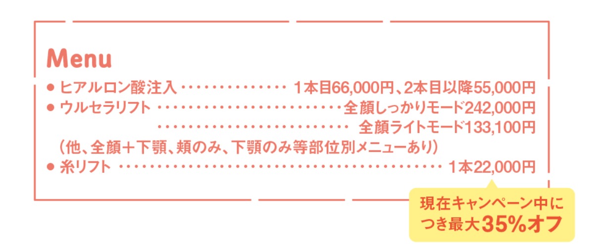 下垂によるたるみには、ウルセラリフト(高密度焦点式超音波:HIFU)、糸リフトを行っています。ウルセラリフトは、超音波で焼くことで浅筋膜をギュッと引き締める施術ですが、それだけではなく、同時に重い脂肪を減らす効果もあります。当院では従来のしっかりモードに加えて、ライトモードの2コースを用意しました。詳しくはお問い合わせくださいね。