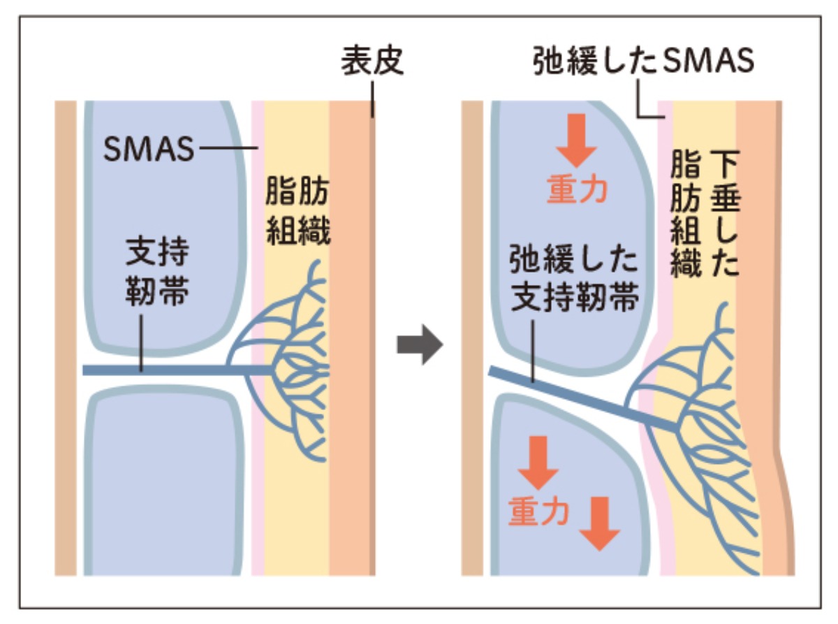 一方で、「下垂」というのは文字通り皮膚が落ちてくること。例えばお面を被ります。初めのうちはビシッとお面が張り付いていますが、そのうちゴムが緩んでお面がだんだんと下がってきますよね。お面に相当するのが皮膚で、骨にしっかりと皮膚を固定するゴムの役割をしているのが浅筋膜(SMAS)と支持靱帯という部分になります。ここが緩むと皮膚が下がりたるむのです。