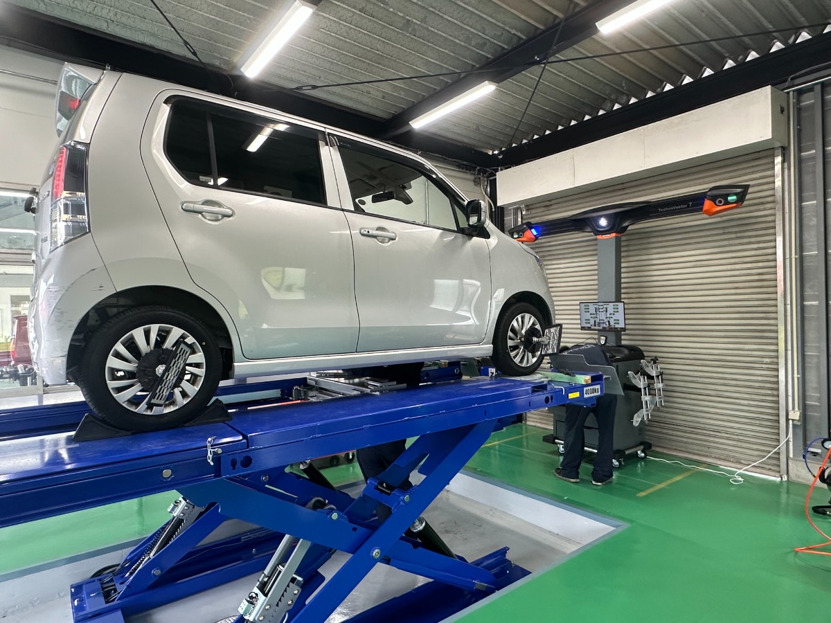 タイヤが地面に対して適切な角度で取り付けられているか測定し、狂いが生じている場合には適正な位置に調整する作業です。