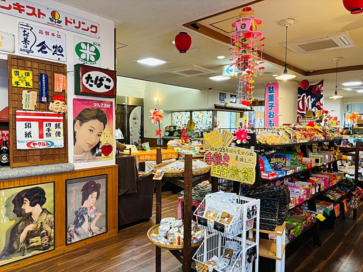 「鈍川せせらぎ交流館」の館内では、昔懐かしの駄菓子やブリキのオモチャなどが販売されており、昭和レトロに彩られた老若男女が楽しめる空間になっています。大人気の鈍川温泉限定の商品や玉川産の朝採れ野菜なども販売されており、お土産にもおすすめ。地元の特産品をもちいた地産地消のアイスもぜひ味わってみてくださいね。