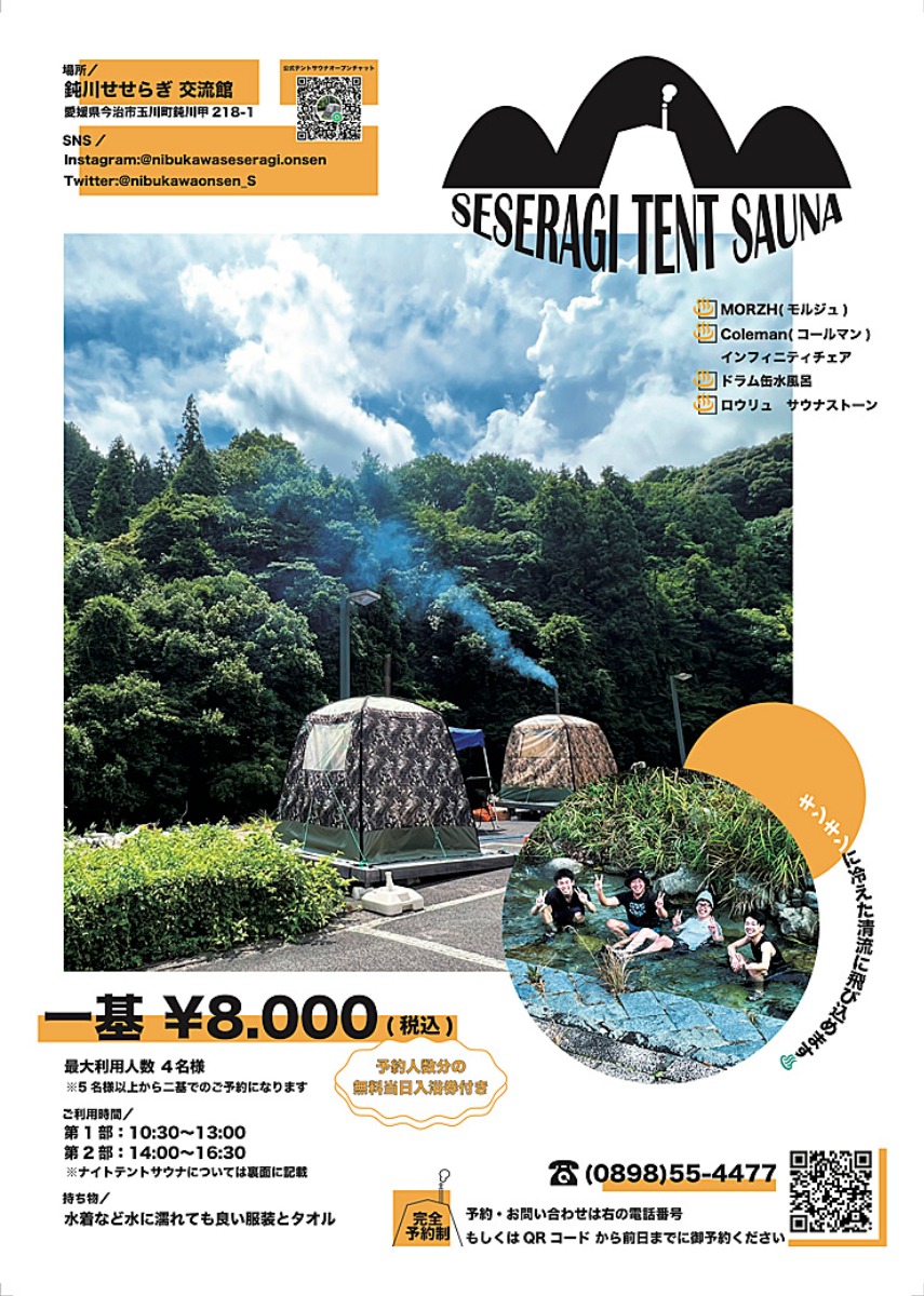 「鈍川せせらぎ交流館」では、自然の中で楽しめる“テントサウナ”も体験できます。目の前を流れる清流のせせらぎを聴きながら、心身ともにリフレッシュしましょう。