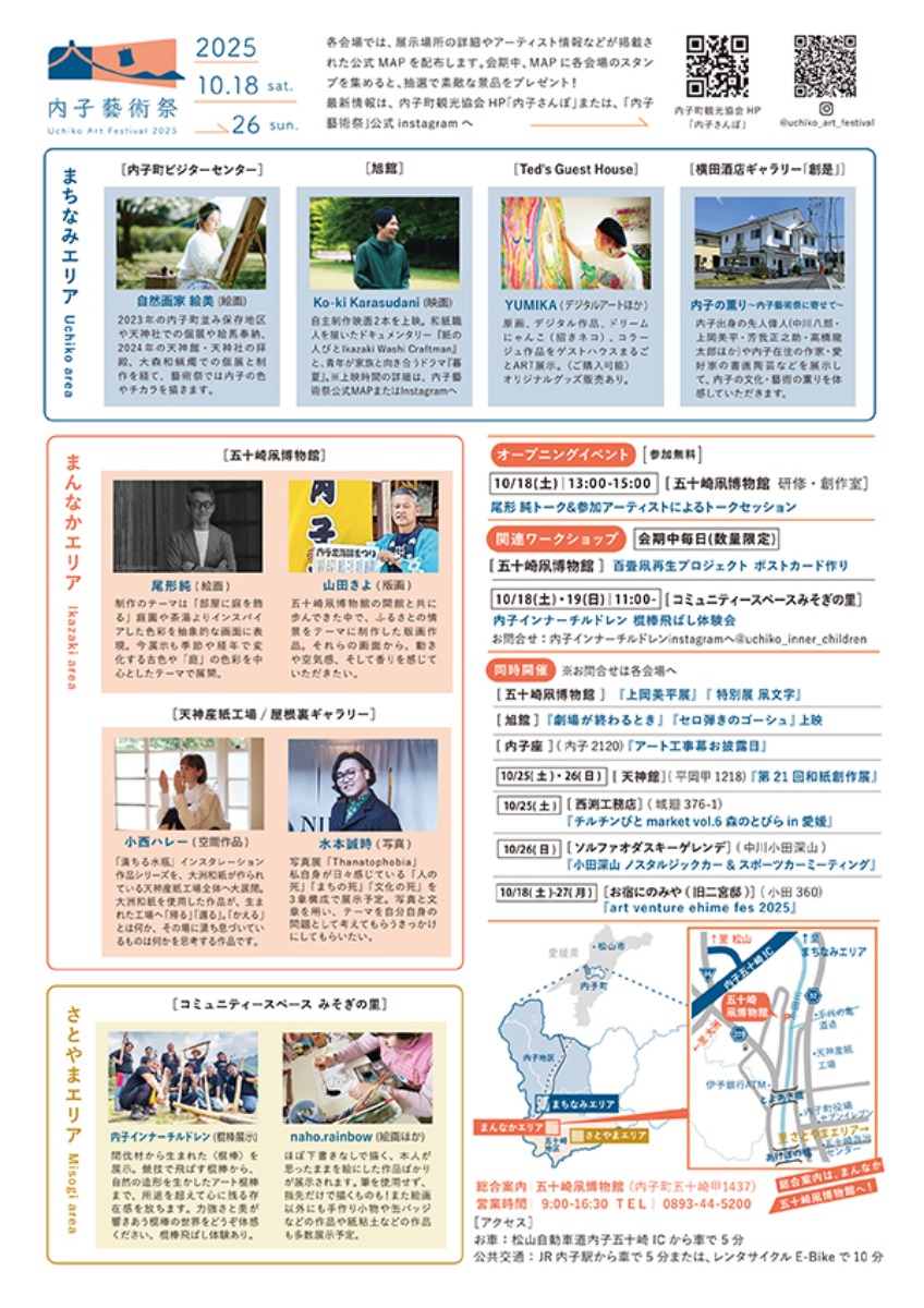 開催場所/五十崎凧博物館・天神産紙工場及び屋根裏ギャラリー・内子町ビジターセンター・旭館・Ted’s Guest House・コミュニティースペースみそぎの里・横田酒店ギャラリー「創是」