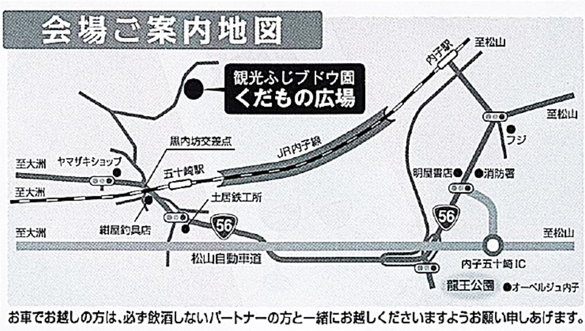 会場の内子ワイナリーは大洲市喜多山112番地にあり、高速道路利用の場合は「内子五十崎IC」から車で約5分とアクセス抜群。(観光ふじブドウ園くだもの広場も内子ワイナリーと同じ場所です。)