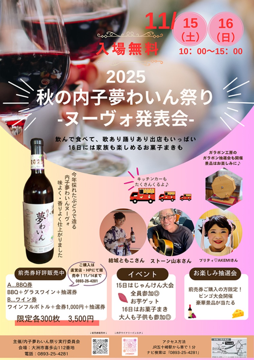 毎年多くのワインファンや家族連れで賑わうこのイベントは、2025年11月15日(土)・16日(日)の2日間、内子ワイナリーで10時から15時まで開催予定です。