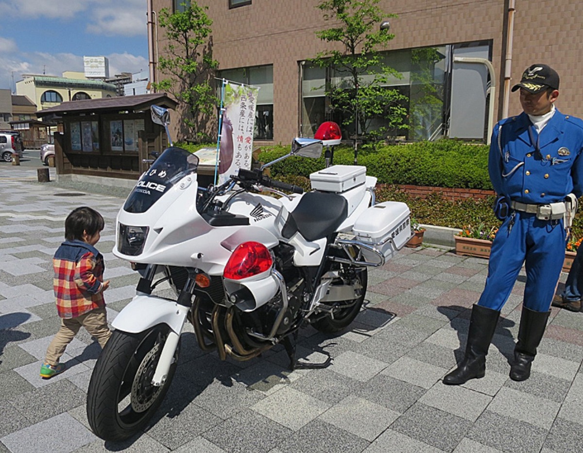パトカーと白バイがやってきます。実際に乗車して、記念撮影もできます。