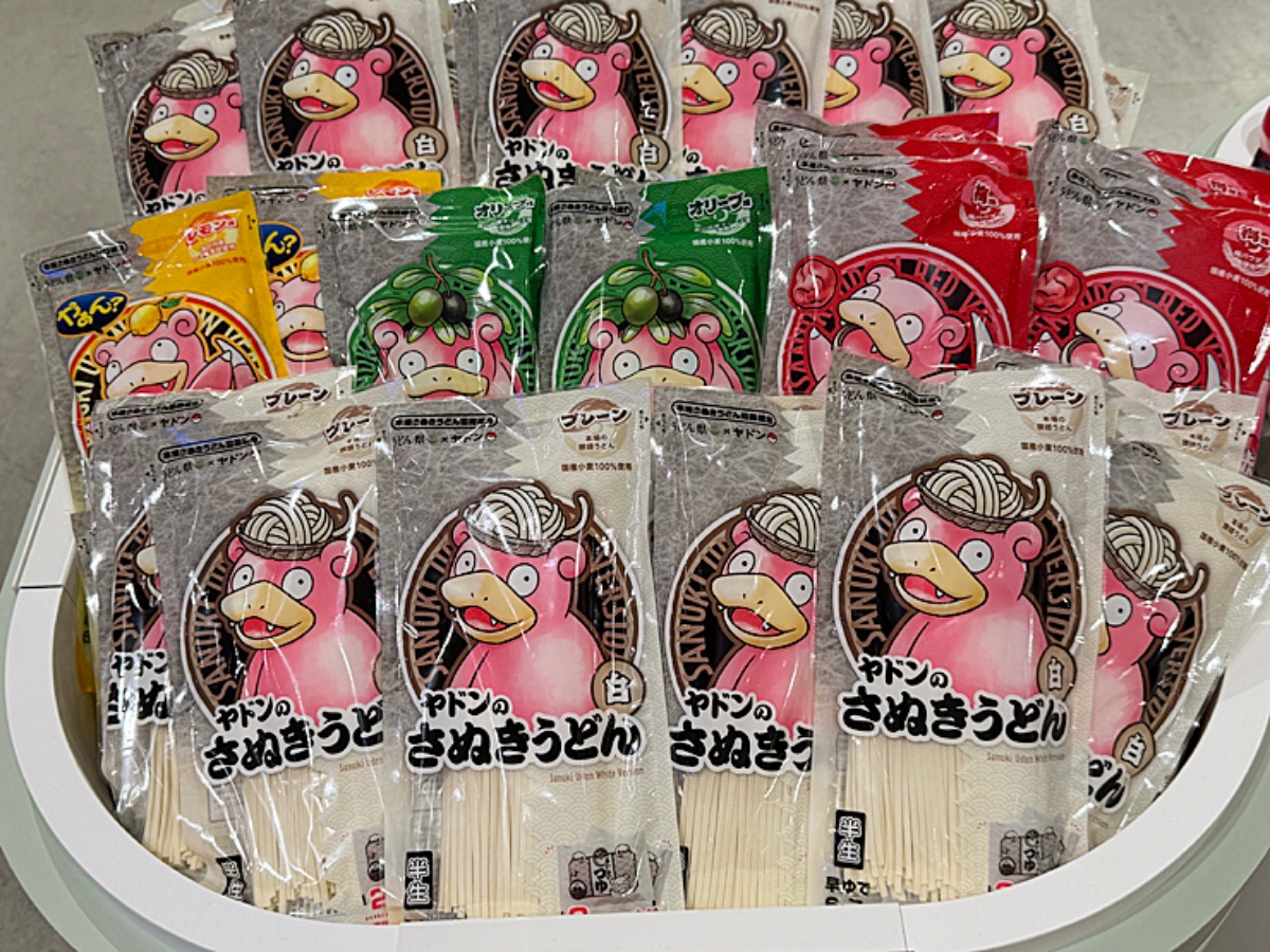 ヤドンとうどんを掛け合わせたアイテムやデザインなど、お土産にも喜ばれるラインナップ。