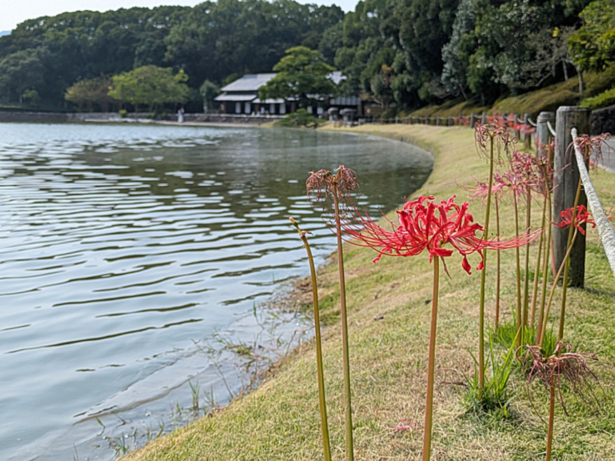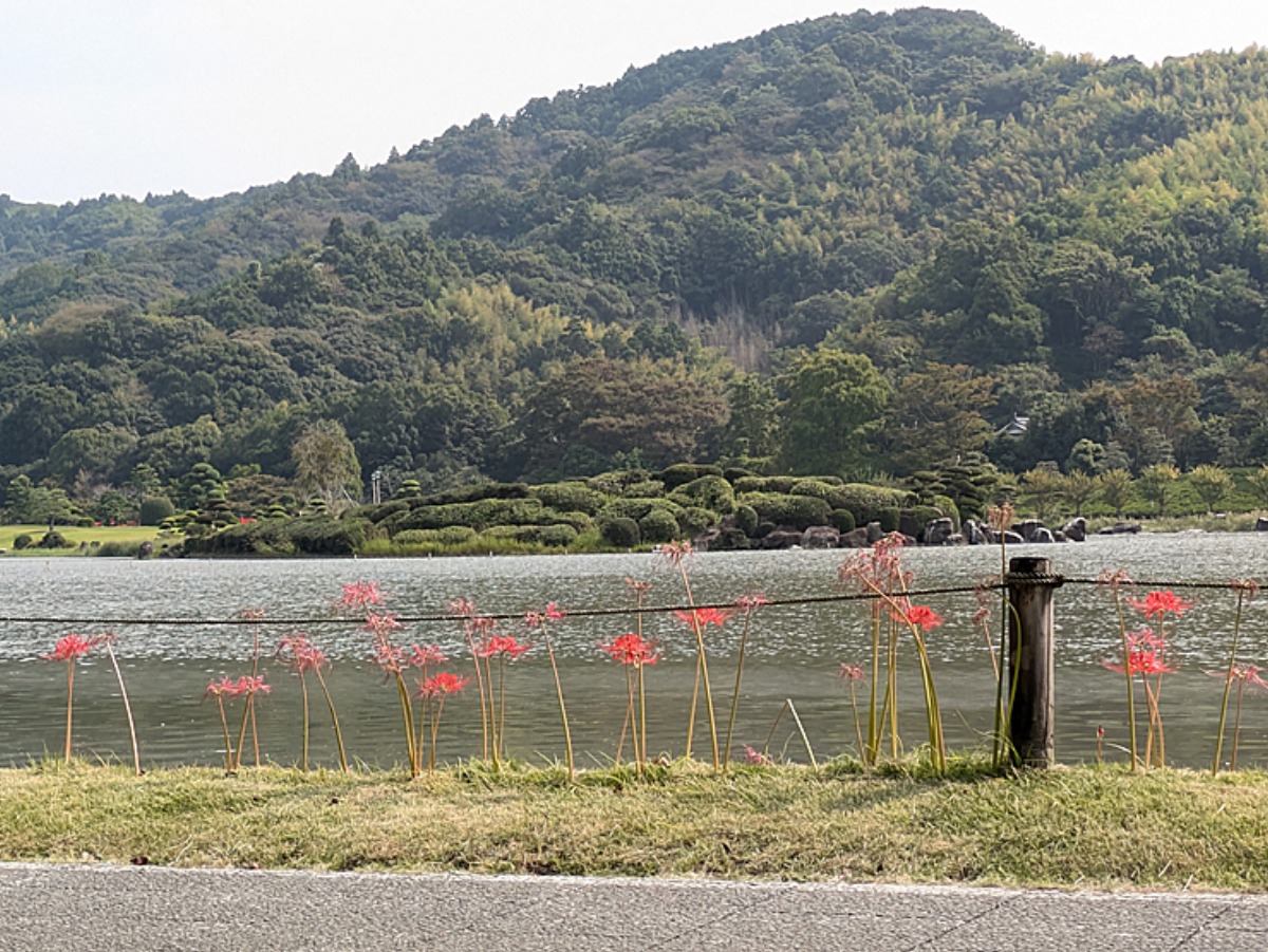 タイミングが合えば、池に沿ってずらっと並ぶ彼岸花が見られます。
