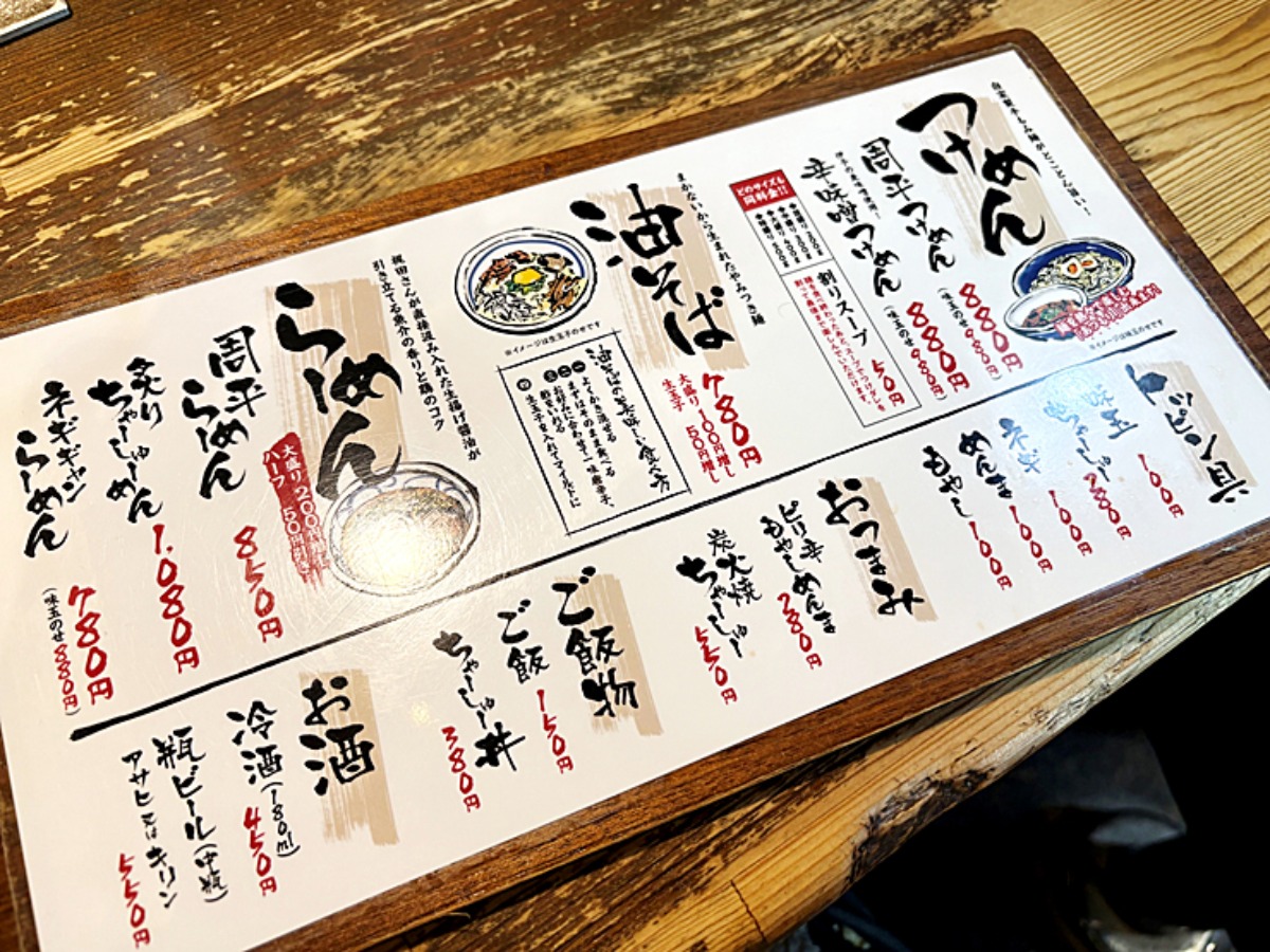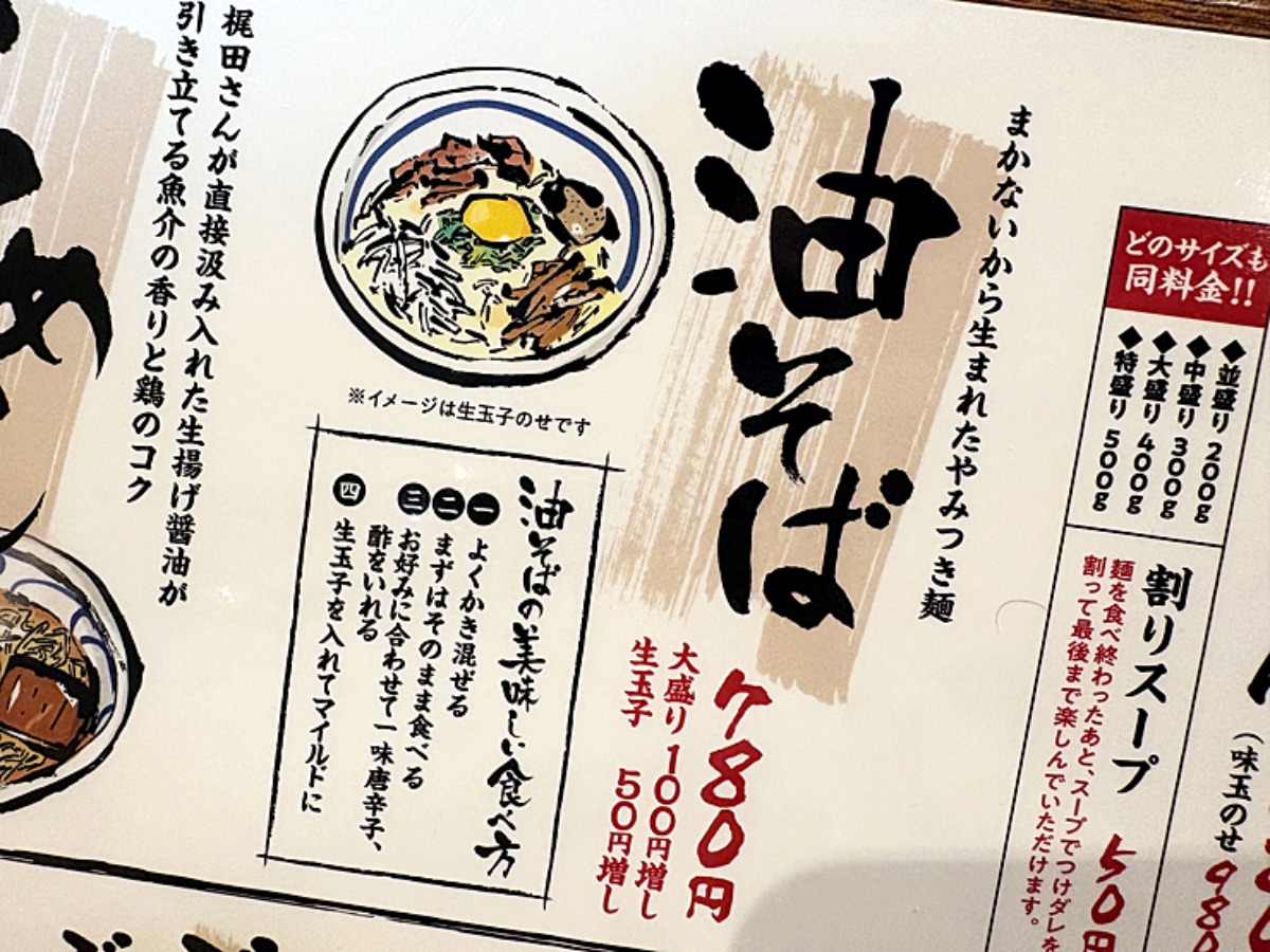 定番のメニューは、「醤油ラーメン」「つけ麺」「油そば」の3種類。