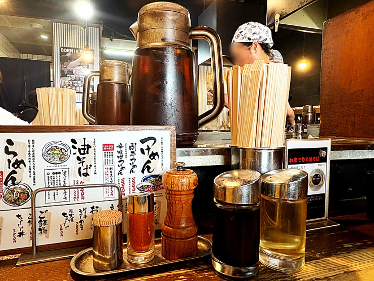 調味料類はこちら。醤油とお酢は油そばを注文すると店員さんからカウンター越しにもらえます。