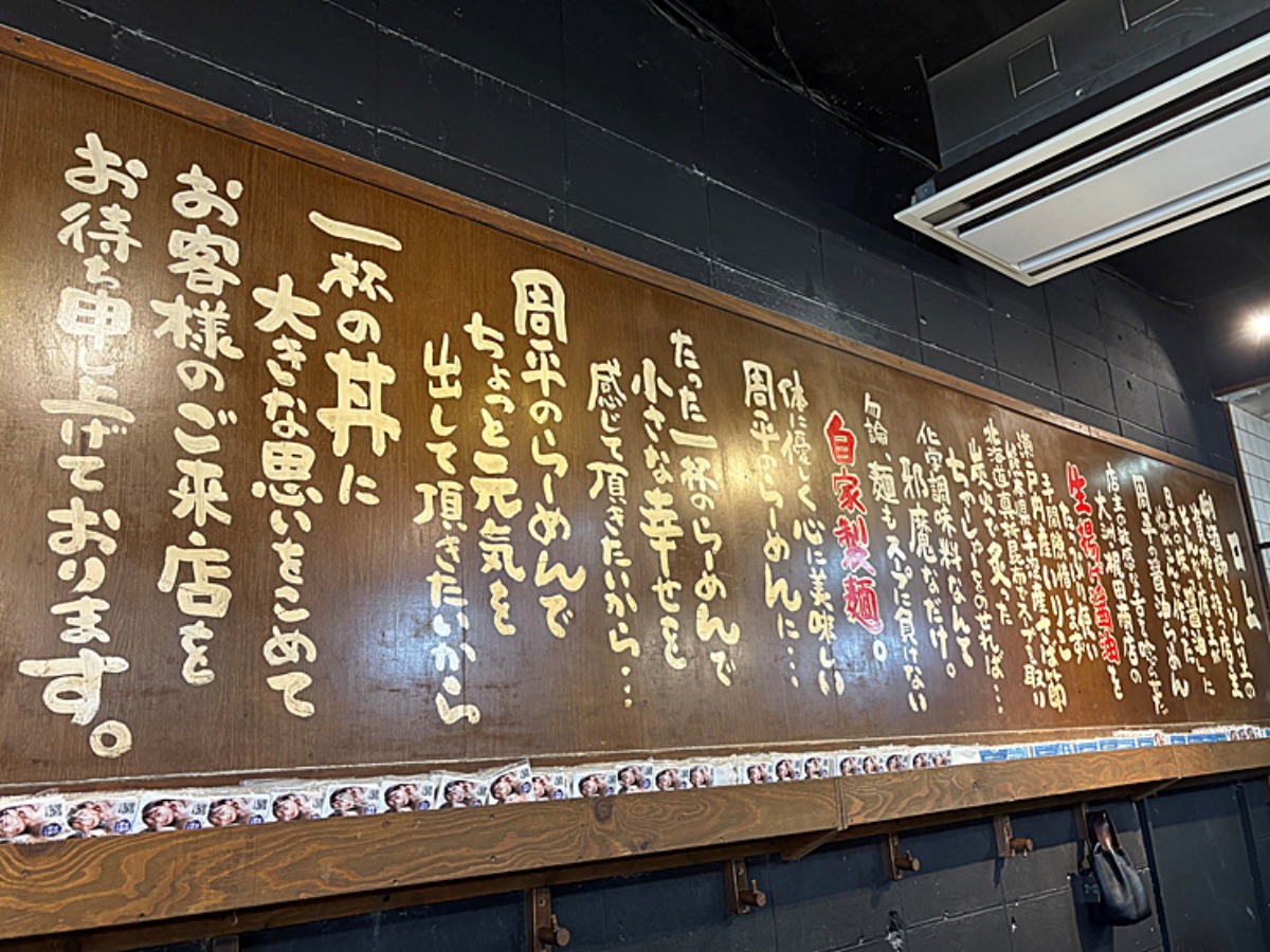オーナーさんのこだわりがうかがえる壁の口上も要チェック。他にはない「醤油」と「自家製麺」が美味さの秘訣です。