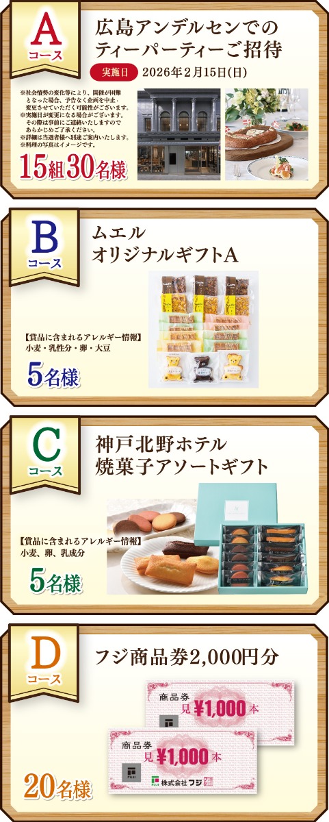 キャンペーン期間中、フジ・フジグラン各店直営売場にて協賛メーカーの対象商品を合計500円(税込)以上のお買い上げで応募完了