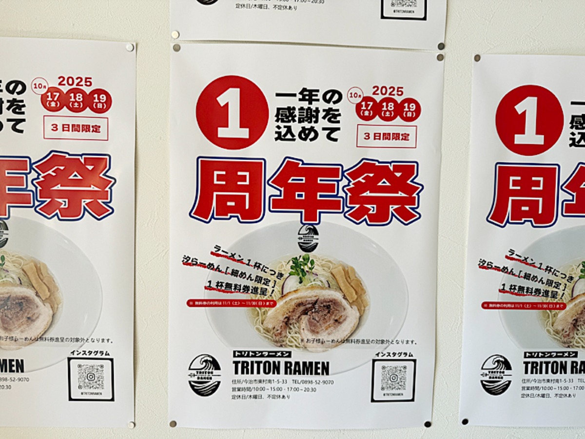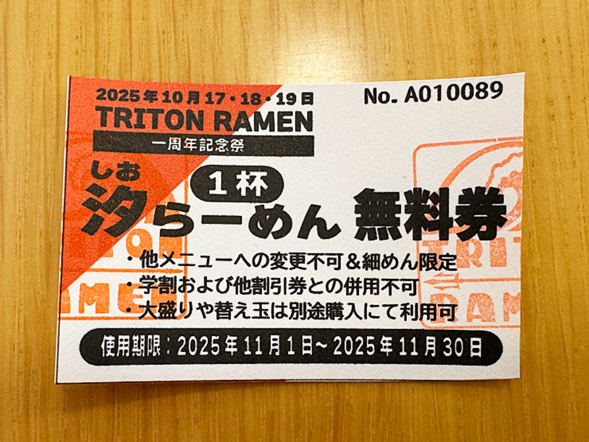 この日(2025年10月17日〜19日)は、なんと1杯食べると「汐らーめん(細めん限定)」の無料券がもらえる周年祭が開催していました!