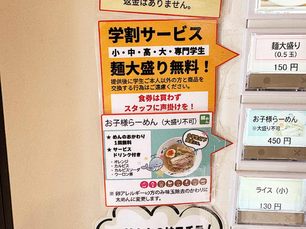 小・中・高・大・専門学生は麺大盛り無料!(食券は買わずスタッフに声をかけるだけ)