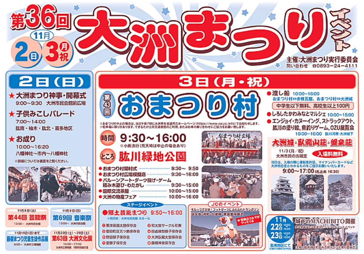 なお、例年同日開催だった「城下のMACHIBITO」は2025年は別日程(11月22日・23日)となるため、今年は大洲まつりに集中して秋のひとときを楽しめますよ。