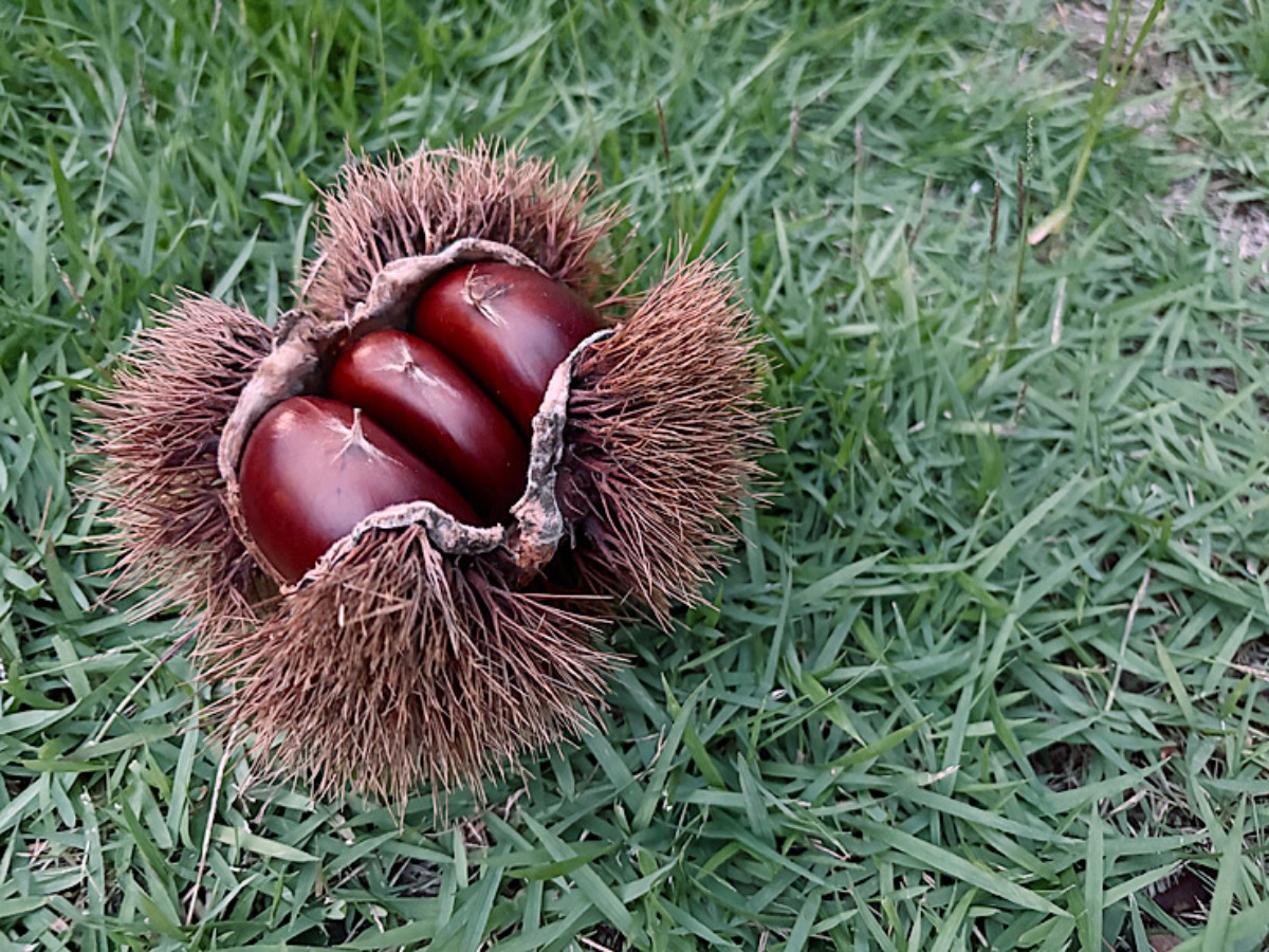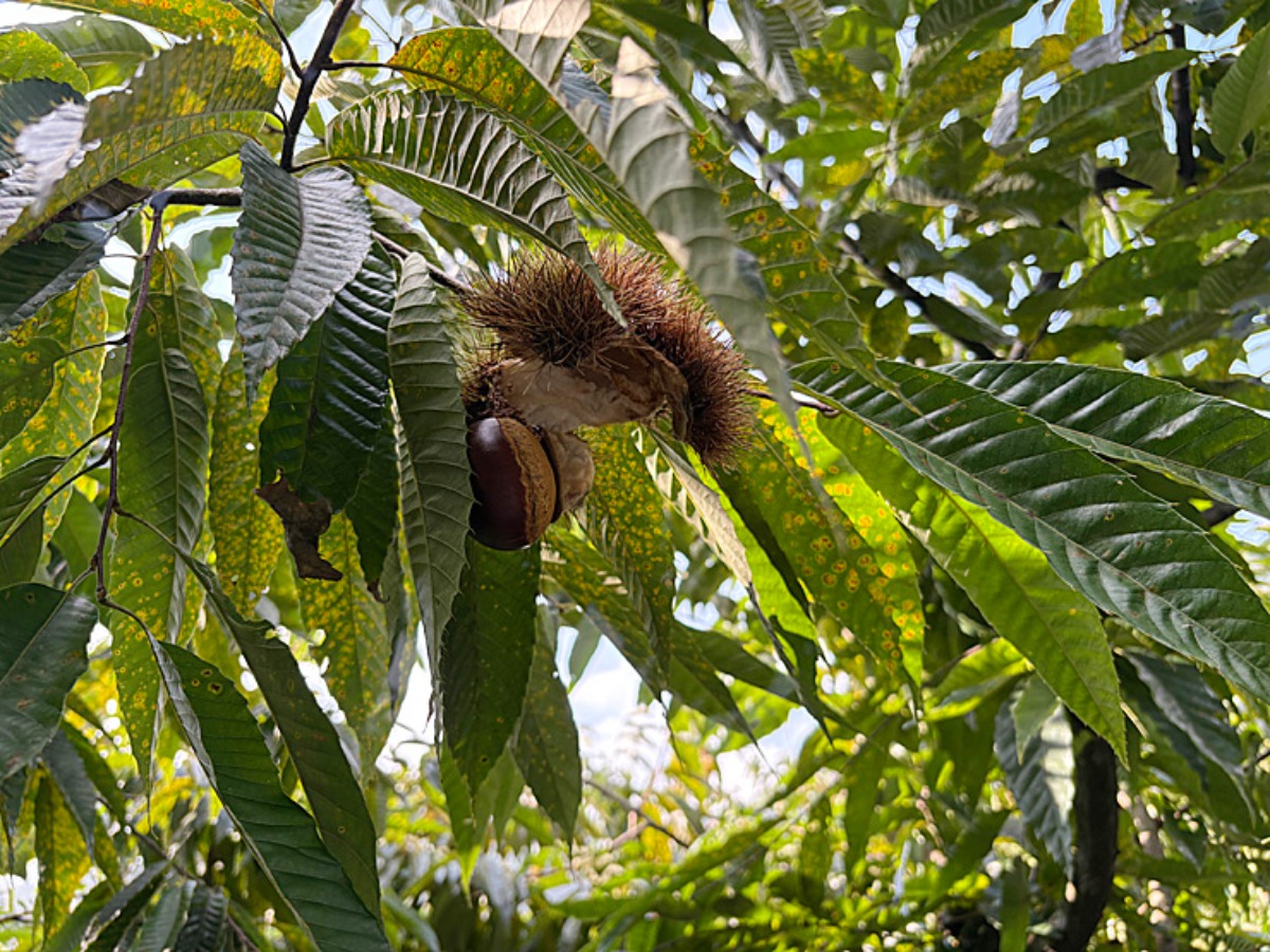木漏れ日の下で、艶やかに実る大粒の栗。