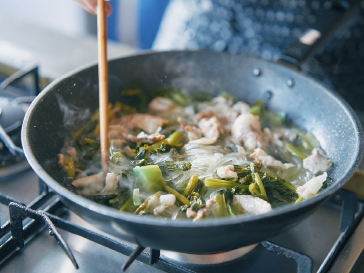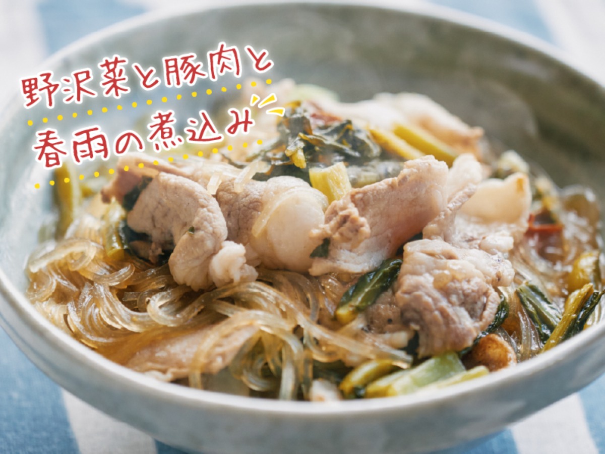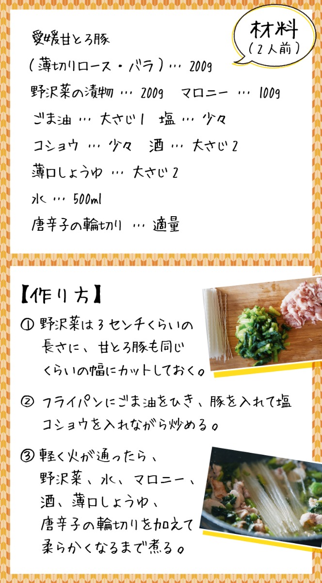愛媛甘とろ豚は、バラ肉とロースを半分ずつ使い食感にアクセントを。野沢菜のほどよい酸味と、甘とろ豚の甘みが生み出す旨味。その旨みを、マロニーがしっかり吸収してくれます。こちらも、とても食べ応えのあるボリュームおかずになりますよ。