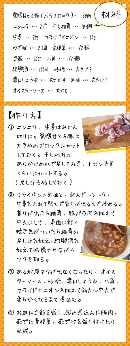 時間があれば1時間ほどかけてゆっくりと煮込むのがおすすめ。愛媛甘とろ豚がホロリと口の中でほどけて、ご飯が止まらなくなる美味しさです。