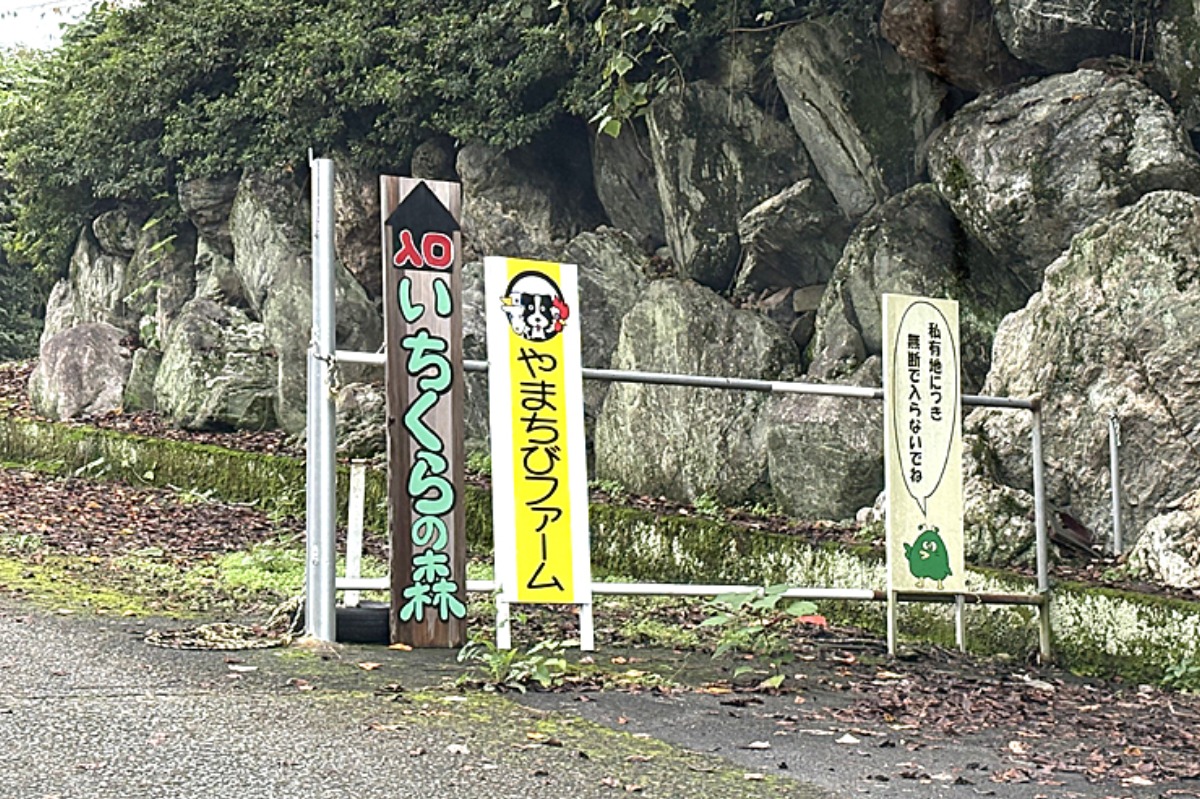 西条市の加茂川を高知方面に走ると見えてくる旧市倉ファームの看板を目印に登っていくと、やまちびファームの看板がお出迎え。
