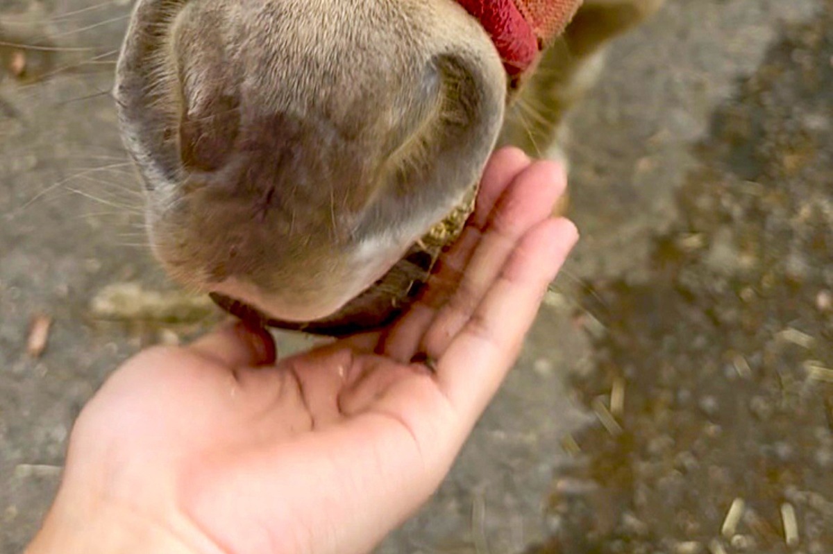 干し草キューブを手のひらに乗せると、ポニーが器用に食べてくれました。