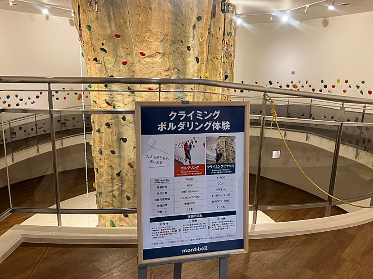 館内に高さ6mの本格的なロープクライミングできるクライミングピナクルとお子さまでも楽しめるボルダリングウォールがありました。