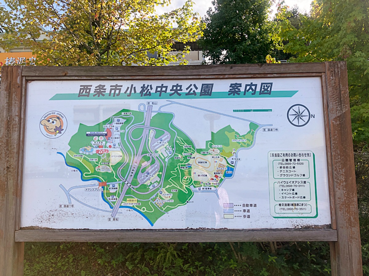 「モンベルアウトドアオアシス石鎚」を過ぎて、少し歩いていると、西条市小松中央公園の案内図を発見!