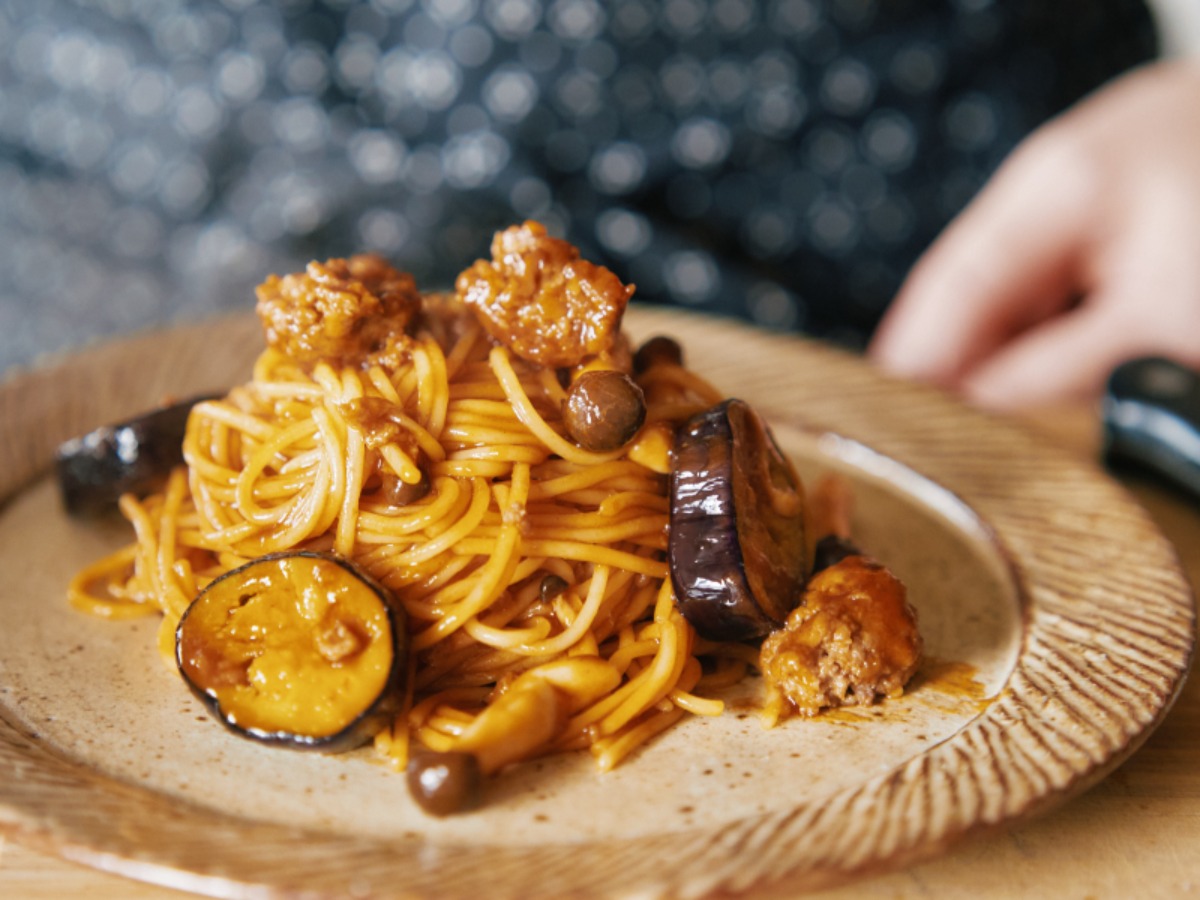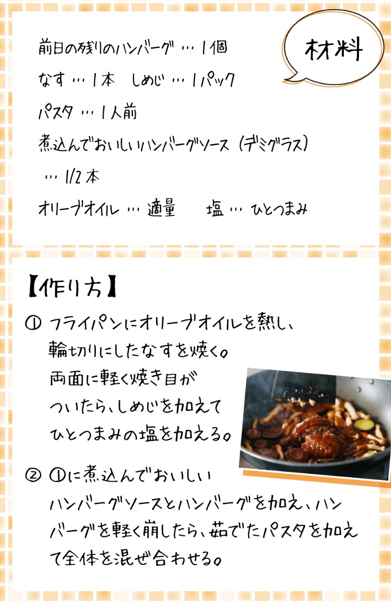 ハンバーグはゴロゴロ感が残る程度に崩すと、食べ応えのあるボロネーゼになります。お好みで粉チーズをかけても。今回はなすとしめじを使いましたが、いろんな野菜との相性も良いのでお好きな野菜で試してみてください。