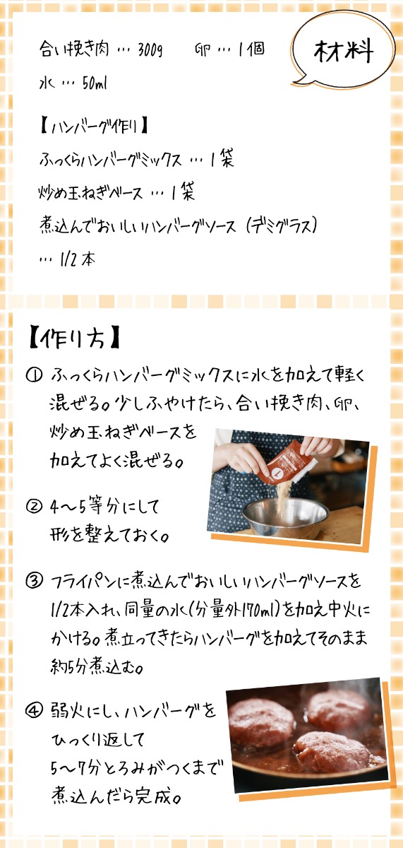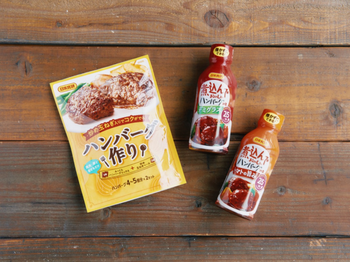 お手軽ハンバーグの救世主が、この日本食研「ハンバーグ作り」と「煮込んでおいしいハンバーグソース」。これ以外に必要な材料はひき肉と卵だけなんです。玉ねぎも、パン粉も牛乳も必要ありません。スパイスやパン粉がブレンドされたハンバーグミックスと、炒め玉ねぎベースをひき肉に混ぜるだけで下ごしらえは完了。そして焼かずにそのままソースに入れてフライパンで煮込むだけで、ジューシーでふっくらな煮込みハンバーグが完成!料理が苦手な方や、忙しい毎日の助っ人になってくれること間違いなしです。もちろん煮込まず、焼いて和風ハンバーグになんていうのもOKです。