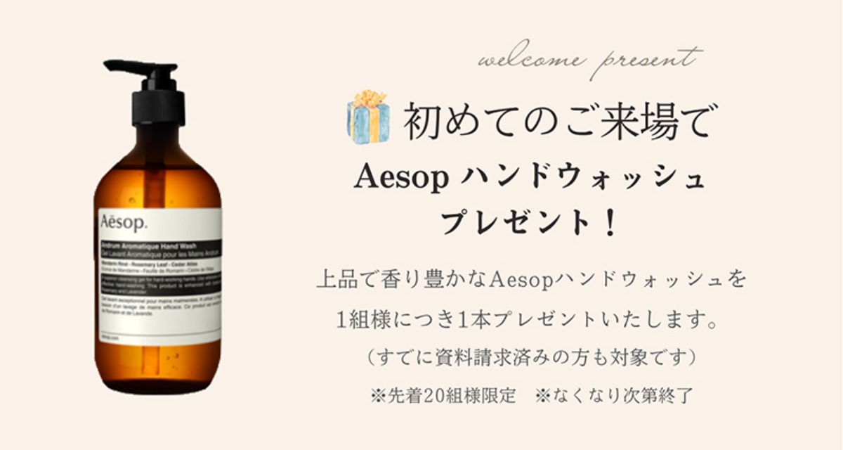 特 典:先着20組限定 初回来場でAesopハンドウォッシュプレゼント!