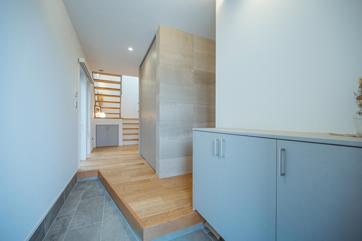 LDKとホールの仕切りを設けず開放的にしつつも、玄関から直接生活空間は見えない設計で、落ち着きとプライバシーを両立。