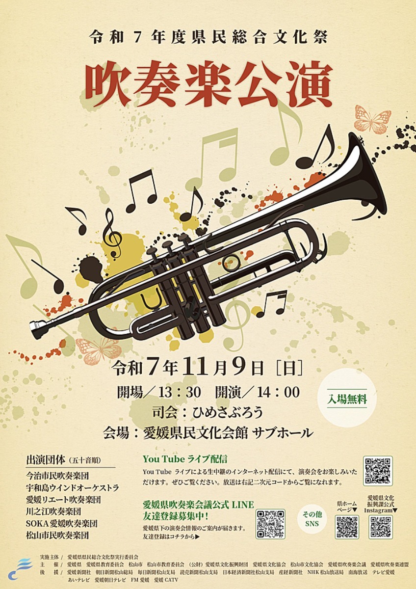 2025年11月9日(日) 、愛媛県松山市の愛媛県県民文化会館サブホールで「県民総合文化祭・吹奏楽公演」が開催されます。