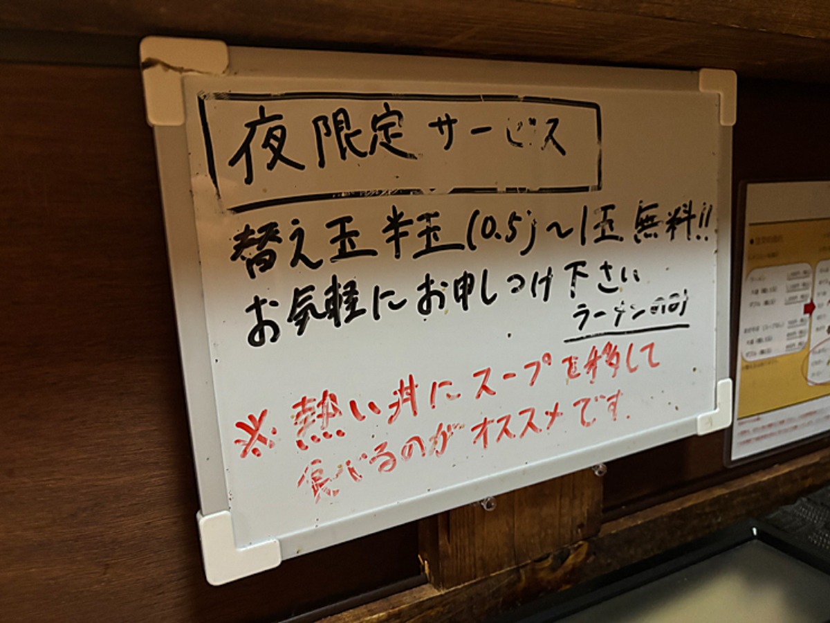 夜限定で、替え玉半玉~1玉無料サービスとのことで、もちろん替え玉をお願いしました。