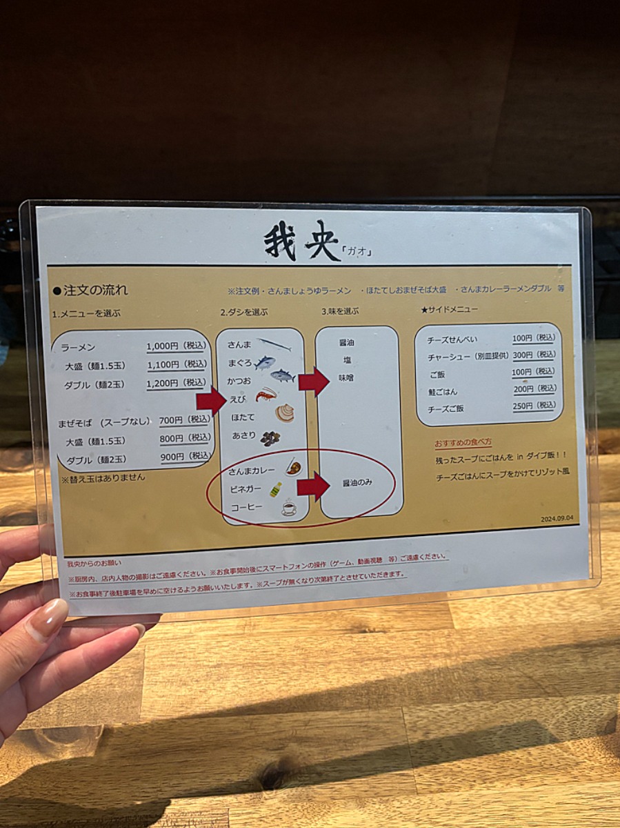 ラーメン屋さんで味を選ぶのは、普通のことですが、我央さんはダシと味をそれぞれ選ぶことができます。