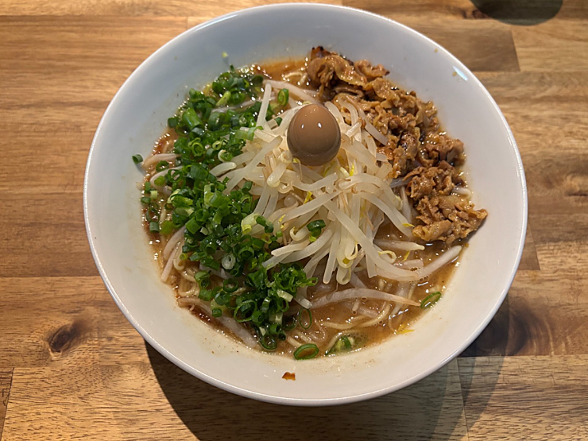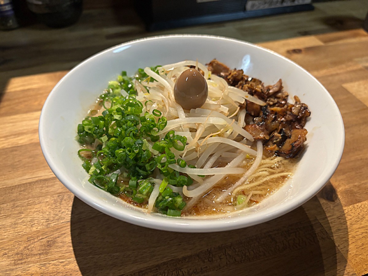 たっぷりのねぎ、もやし、豚バラあぶり肉の3色が特徴的で、上にちょこんと可愛いうずらの卵がのっています。
