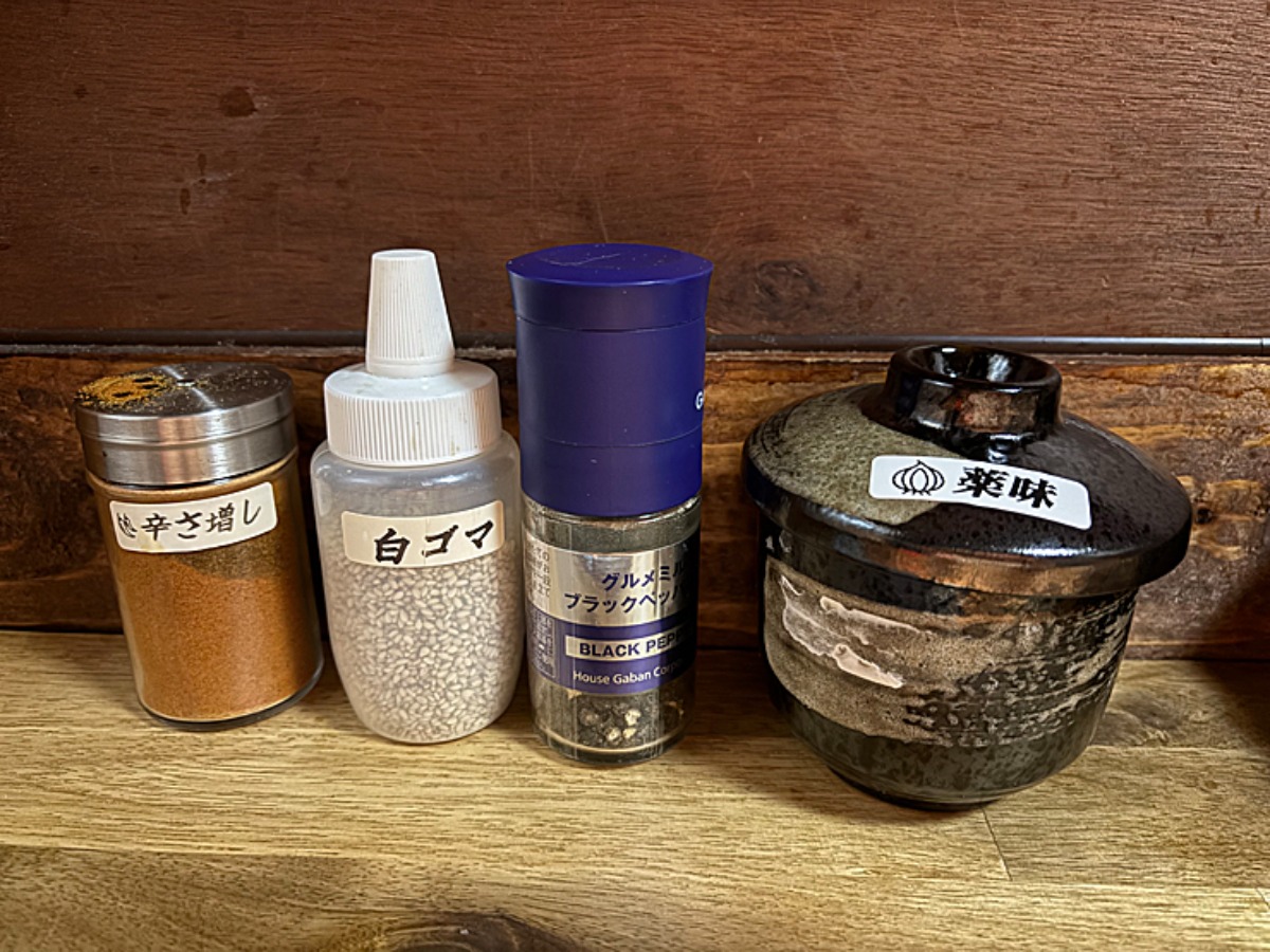 そのままでも美味しい自分でチョイスした推しラーメンですが、席に薬味などが置いてあるので、せっかくなので味変してみました。